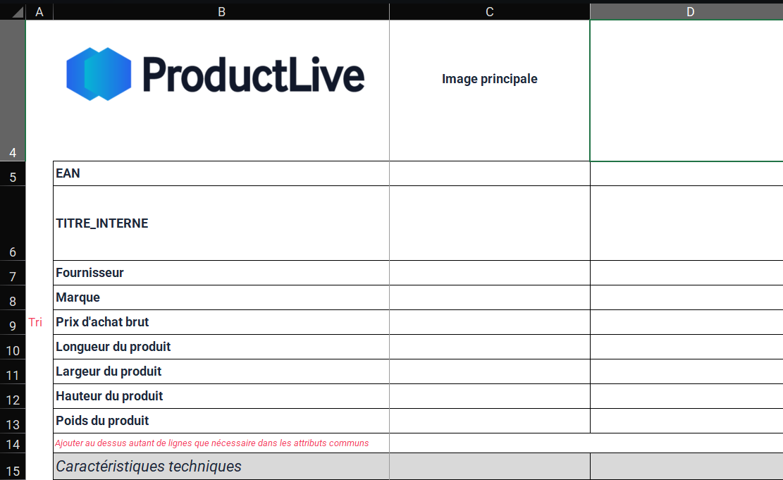 You can add and setup all the wanted commons fields in the assortment plan by adding or editing rows before the grey header row "Caractéristiques techniques".